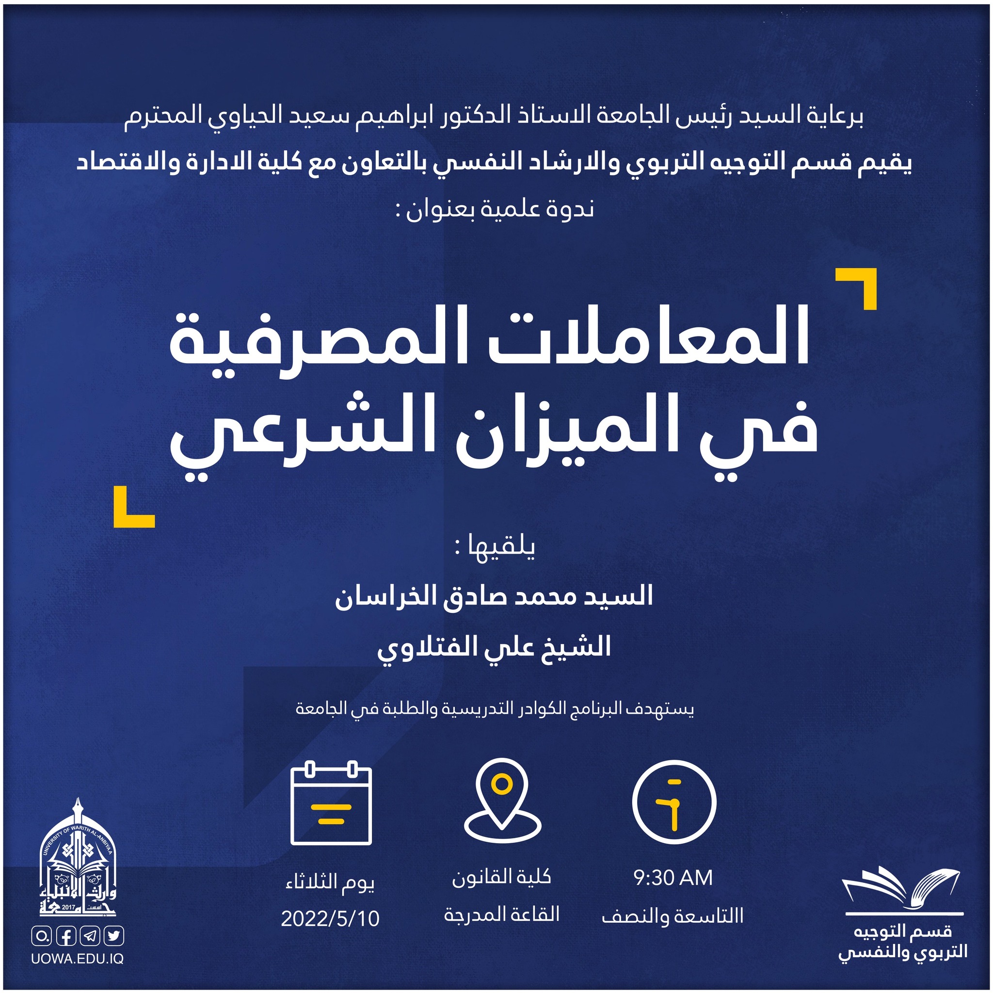 برعاية رئيس الجامعة الاستاذ الدكتور ابراهيم الحياوي يقيم قسم التوجيه التربوي والارشاد النفسي وبالتعاون مع كلية الادارة والاقتصاد، ندوة علمية بعنوان " المعاملات المصرفية في الميزان الشرعي "