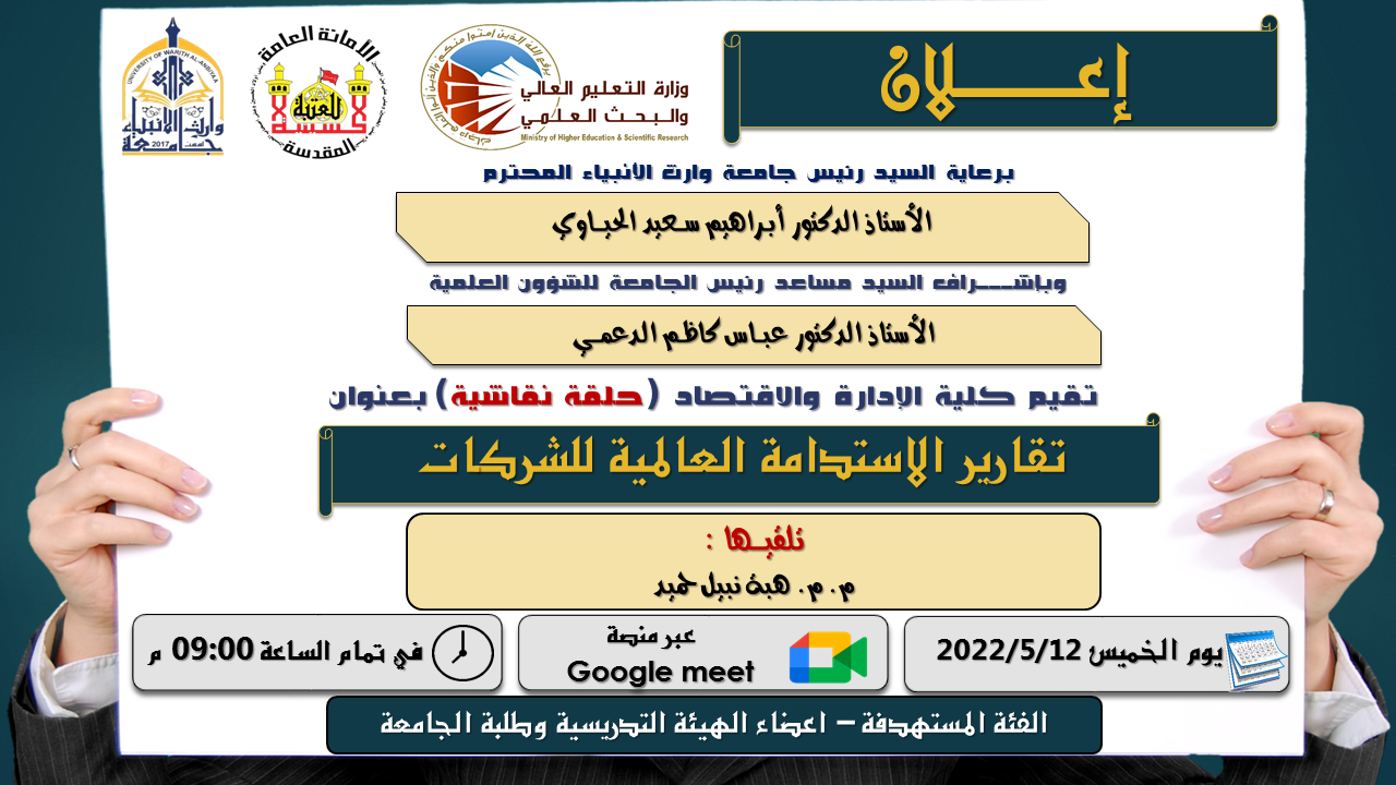 يقيم مركز التعليم المستمر في جامعة وارث الانبياء (عليه السلام) بالتعاون مع كلية الادارة والاقتصاد ندوة علمية بعنوان "تقارير الاستدامة العالمية للشركات"، تلقيها ... م.م هبة نبيل حميديوم الخميس الموافق 2022/5/12 ، في تمام الساعة الـ 9:00 مساءً ، علماً ان الندوة تستهدف الهيئة التدريسية وطلبة كلية الادارة والاقتصاد عبر منصة Google meet من خلال الرابط الآتي : https://meet.google.com/ufy-tobg-yba