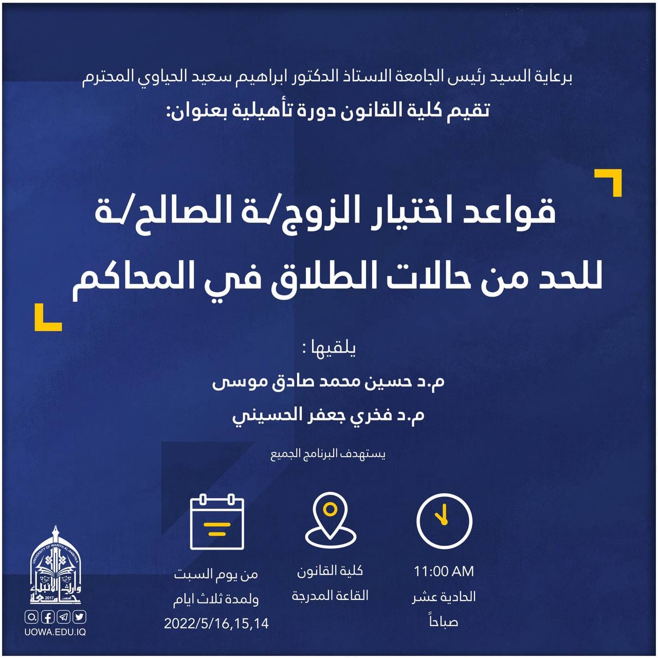 برعاية رئيس الجامعة الاستاذ الدكتور ابراهيم سعيد الحياوي تقيم كلية القانون دورة تأهيلية تحت عنوان " قواعد اختيار الزوج/ة الصالح/ة للحد من حالات الطلاق في المحاكم"