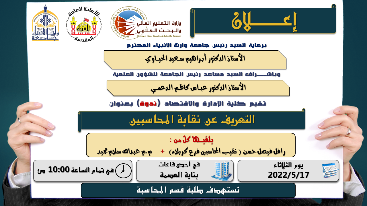 يقيم مركز التعليم المستمر في جامعة وارث الانبياء (عليه السلام) بالتعاون مع كلية الادارة والاقتصاد - قسم المحاسبة ونقابة المحاسبين / فرع كربلاء المقدسة ندوة علمية بعنوان (التعريف عن نقابة المحاسبين):من قبل: السيد ( رافل فيصل حسن ) نقيب المحاسبين والمدققين/ فرع كربلاء المقدسة والسيد ( م.م عبدالله سلام مجيد) تدريسي في قسم المحاسبة جامعة وارث الانبياء (ع).وذلك في يوم الثلاثاء الموافق 17 / 5 / 2022 وفي تمام الساعة 10:00 صباحاً في احدى القاعات الدراسية في بناية العصمة. والفئة المستهدفة طلبة قسم المحاسبة.