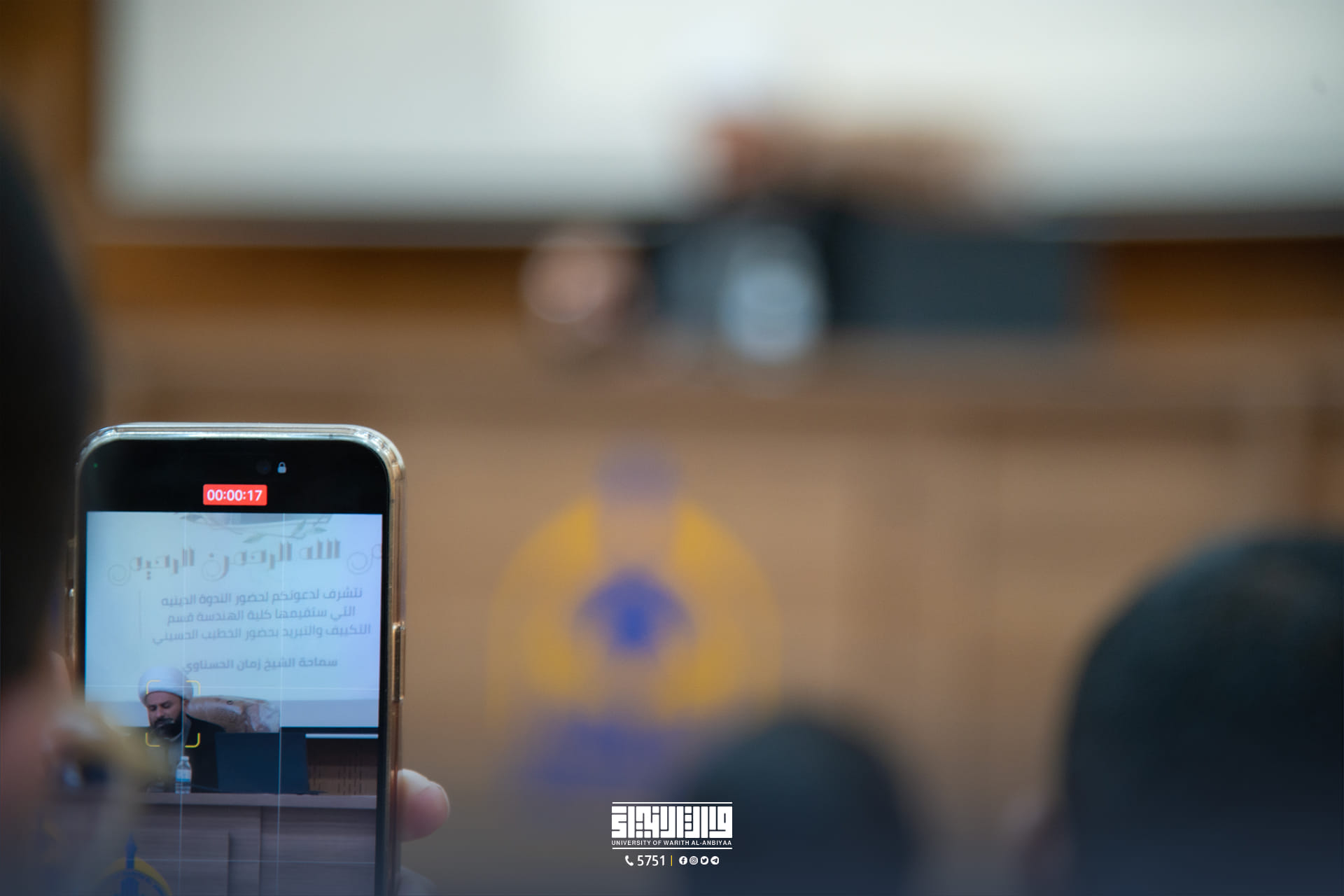 In the distinguished presence of university students, the Deanship of the College of Engineering at the University of Warith Al-Anbiyaa (peace be upon him) hosted the Al-Husseini preacher His Eminence Sheikh Zaman Al-Hasnawi (may his success be long) to present a cultural symposium under the title (The Divine Project in its Seven Stages).