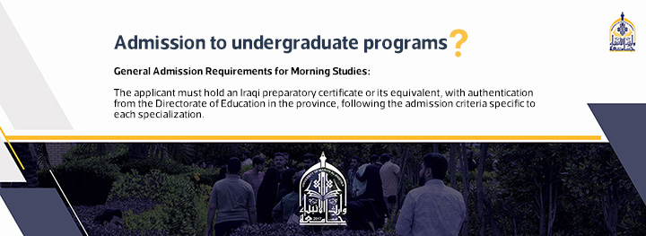 The applicant must hold an Iraqi preparatory school certificate or an equivalent certificate authenticated by the Directorate of Education in the relevant province, in accordance with the specific admission requirements for each programme.