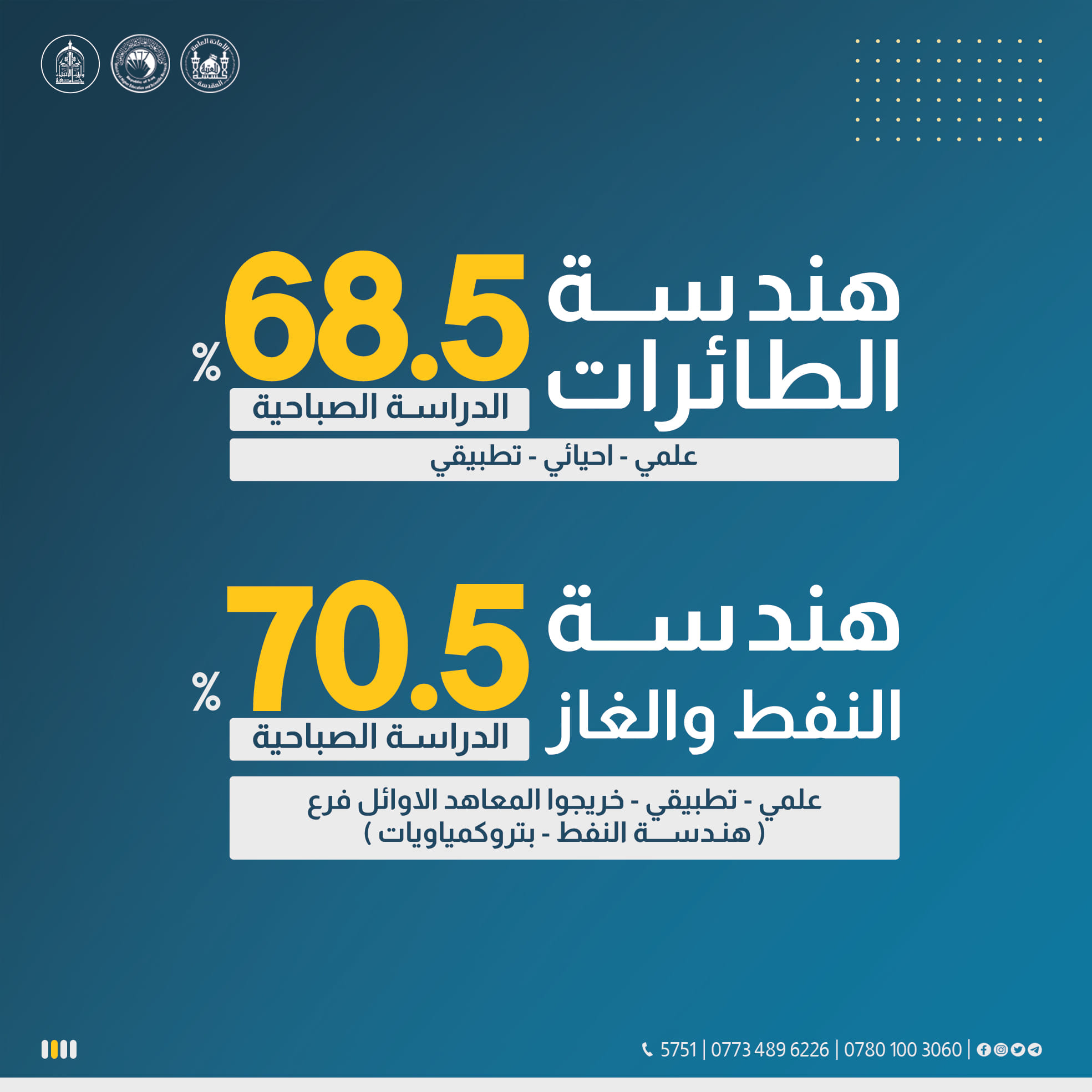 🔸 The minimum admission requirements for both morning and evening sessions for specializations in engineering, engineering technologies, and sciences have been reduced to a current application average of 61, increasing by only one grade.