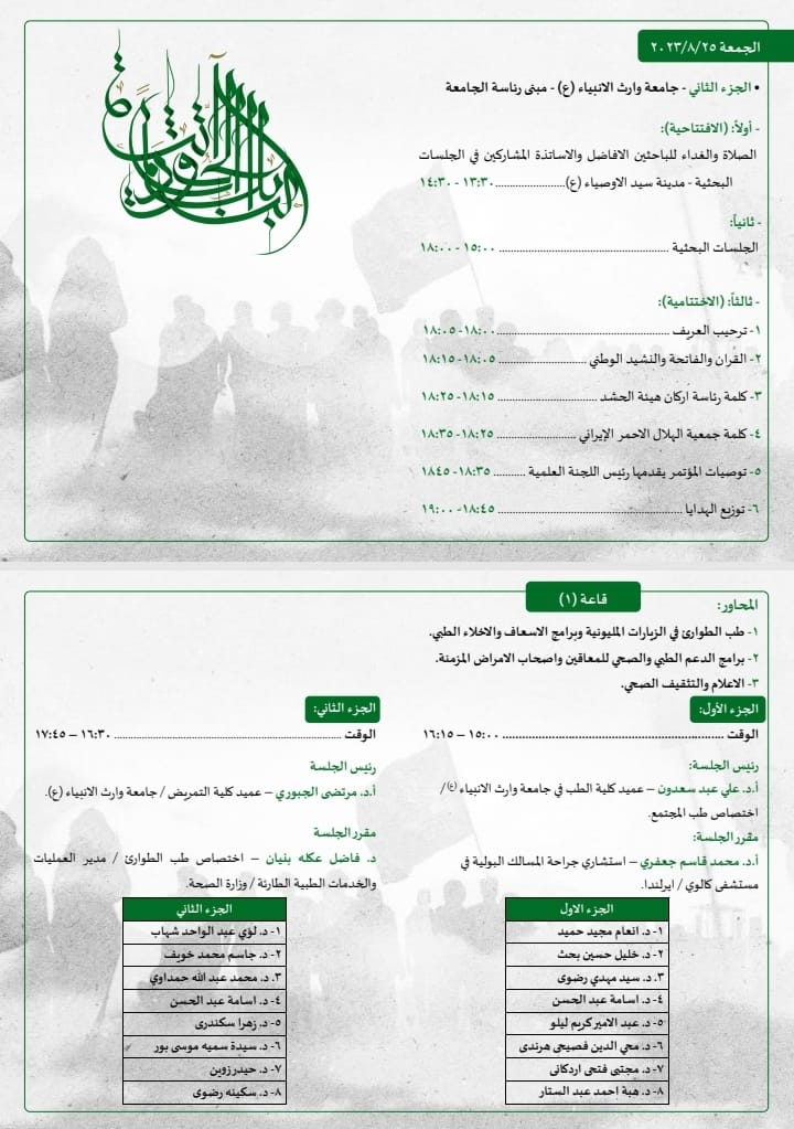 The Popular Mobilization Authority, in collaboration with the University of Warith Al-Anbiyaa (Peace Be Upon Him), is organizing the "First International Medical Mobilization Conference" in cooperation with the Ministry of Higher Education and the Ministry of Health. The conference is held under the theme "Medical Mobilization... The Arbaeen Pilgrimage as a Model" and is scheduled for tomorrow, Friday, August 25, 2023, within the premises of both the University of Warith Al-Anbiyaa (Peace Be Upon Him) and Al-Sibtayn University (Peace Be Upon Them).