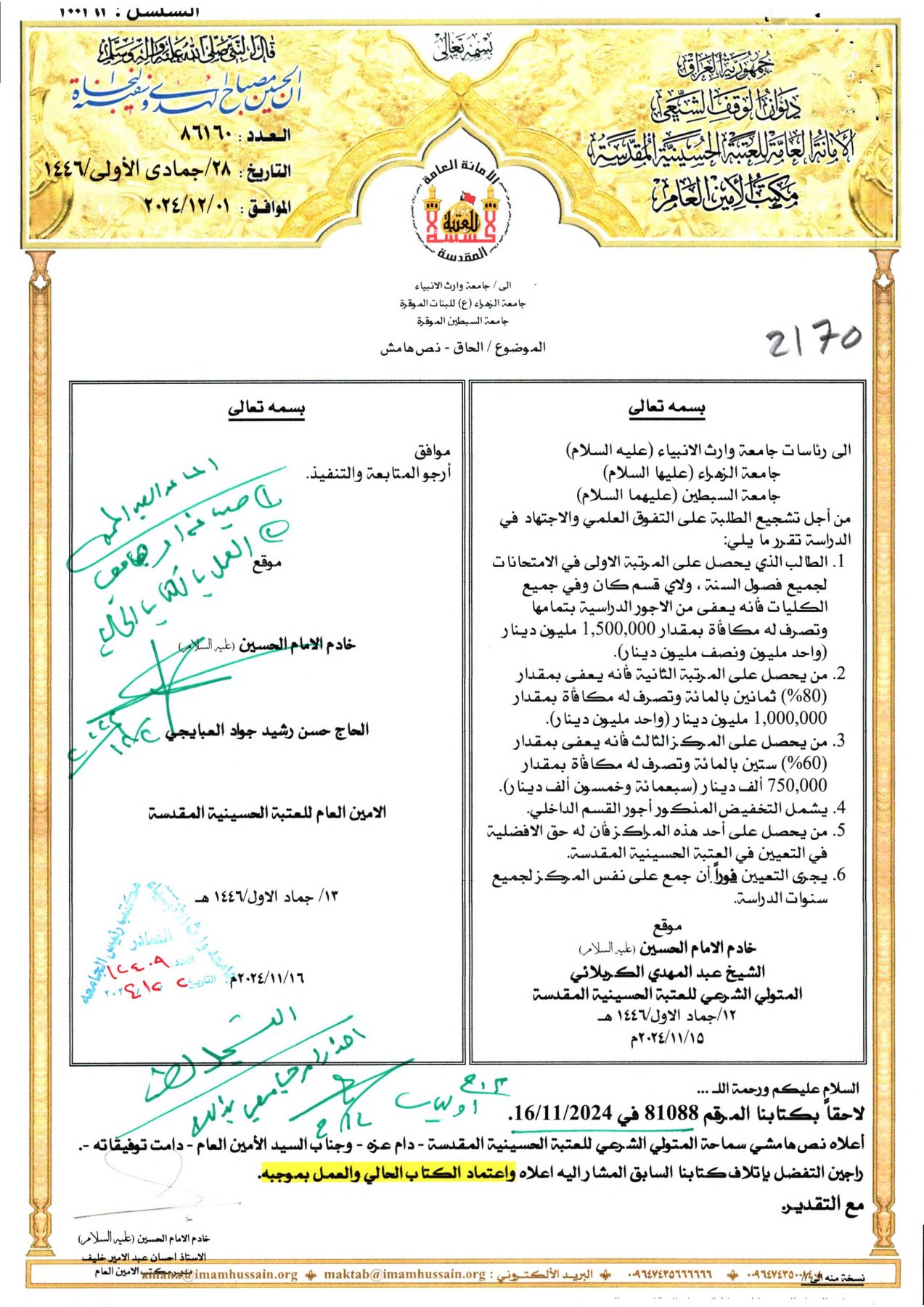 Students who achieve any of these ranks will have priority in employment within the departments of the Holy Shrine of Imam Hussain.