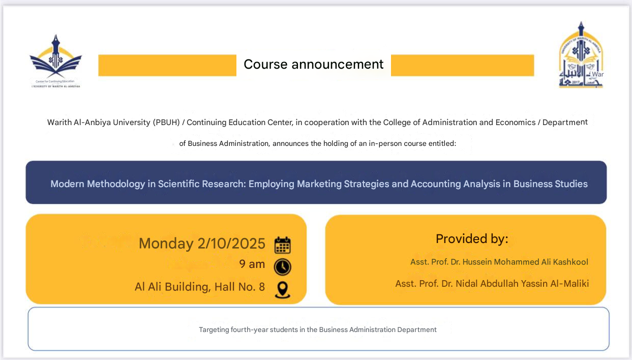 The College of Administration and Economics at the University of Warith Al-Anbiya (peace be upon him) is organizing a three-day course on "The Modern Methodology in Scientific Research: Employing Marketing Strategies and Accounting Analysis in Business Studies." The course will be presented by Assistant Professor Dr. Hussein Muhammad Ali Kashkoul and Assistant Professor Dr. Nidal Abdullah Yassin Al-Maliki.