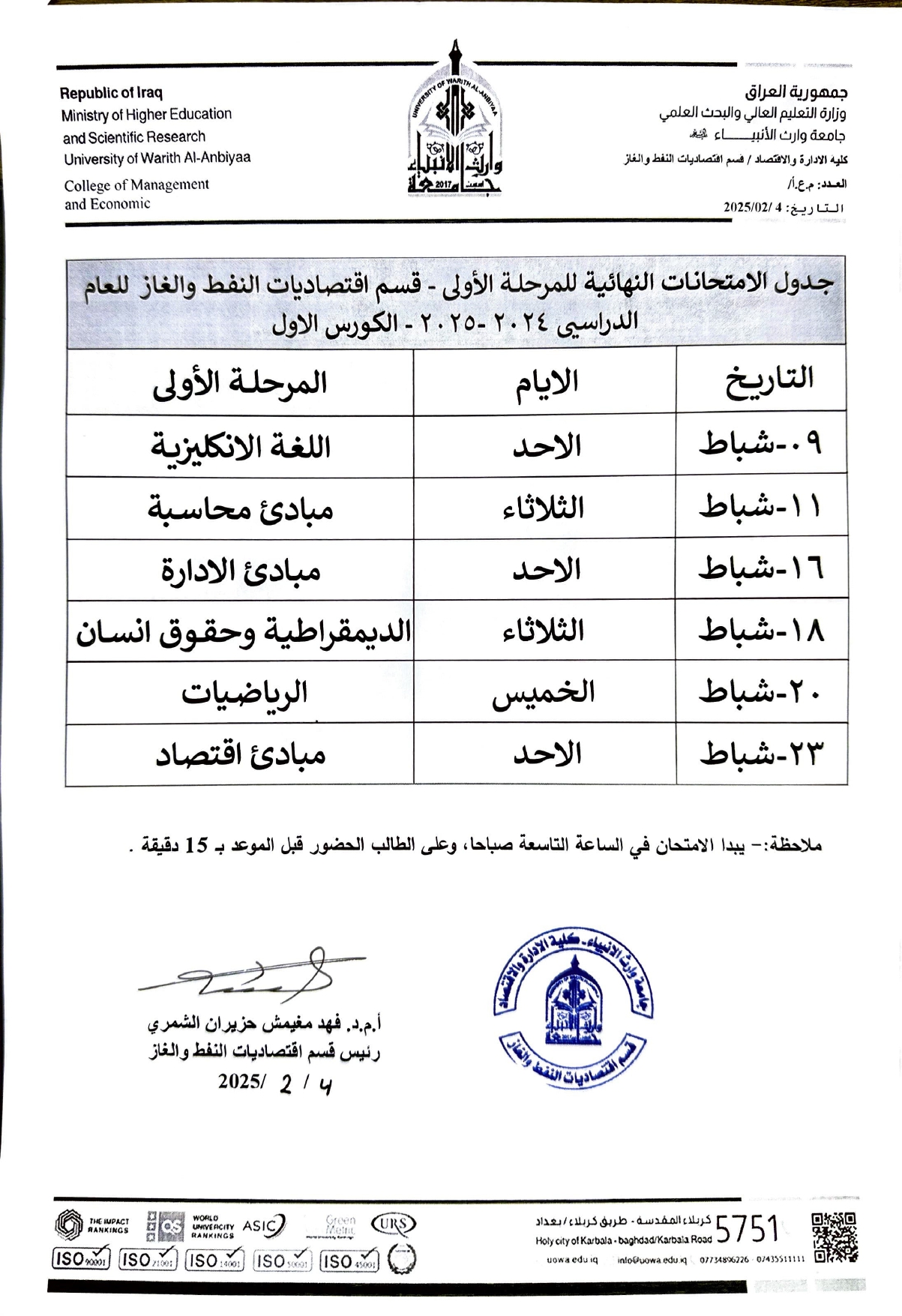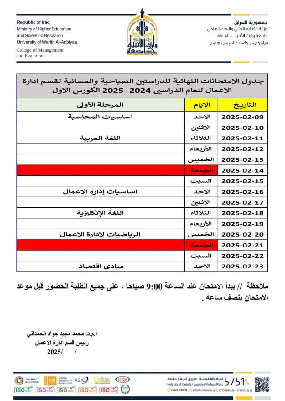 The exams for the academic year 2024-2025 at the Faculty of administration and economics, University of Warith Al-Anbiyaa, in accordance with the approved ministerial regulations and instructions, in an atmosphere dominated by discipline and organization, and with direct follow-up by the university presidency to ensure the efficient and smooth conduct of the examination process .