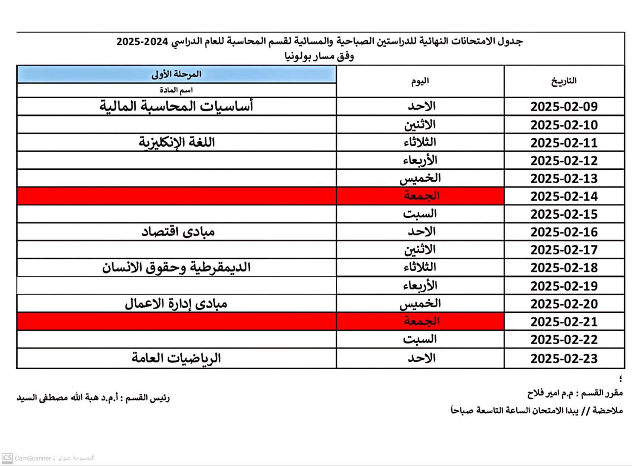 The final exams schedule for the morning and evening studies of the accounting department for the academic year 2024-2025
