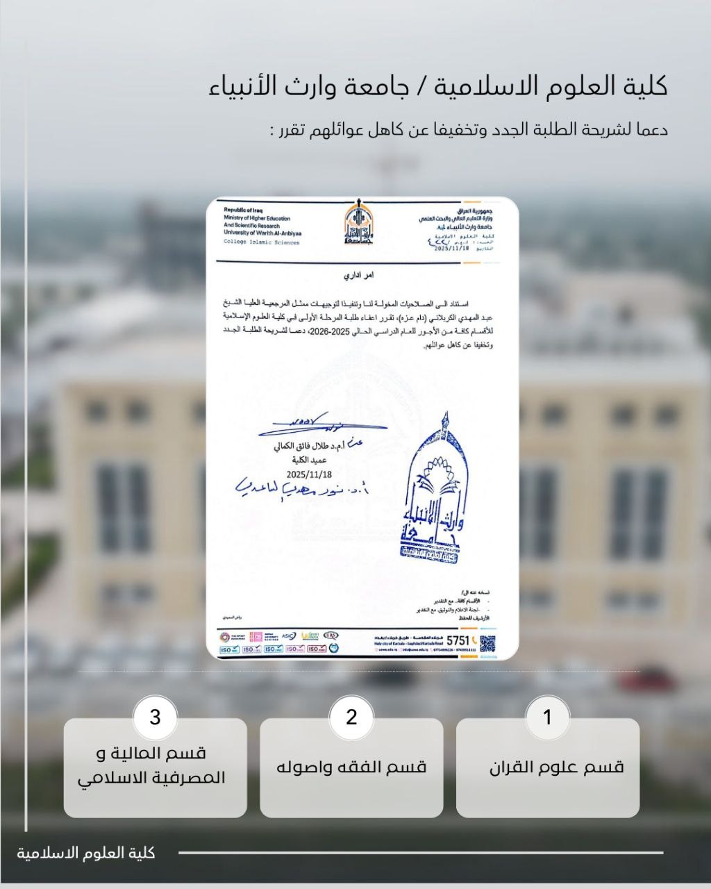 In accordance with the directives of the Representative of the Supreme Religious Authority, Warith Al-Anbiyaa University (peace be upon him) announced that first-year students at the College of Islamic Sciences are exempted from tuition fees for the current academic year 2025-2026.