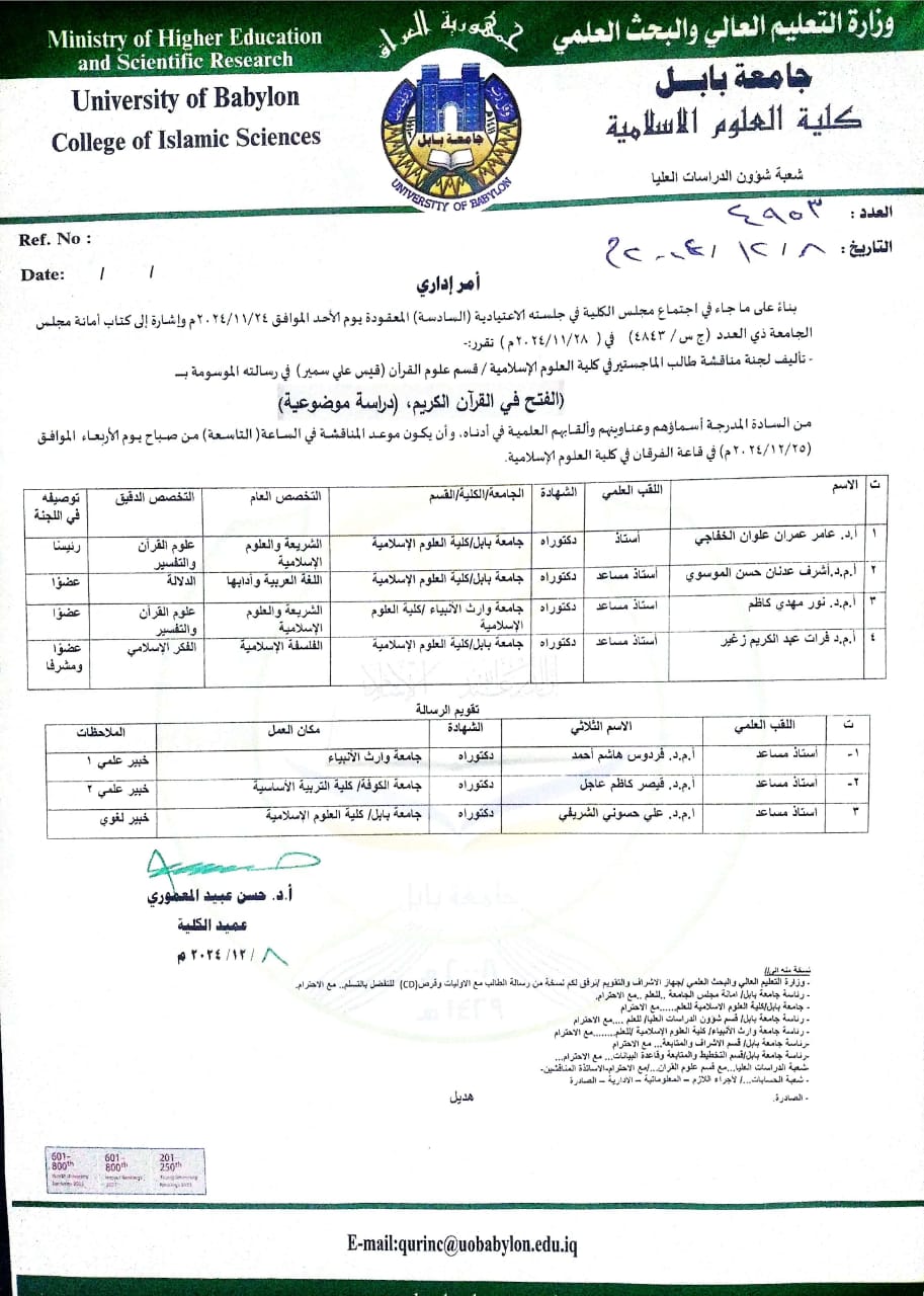Assistant Professor Dr. Noor Mahdi Kazim, a lecturer at the College of Islamic Sciences at the University of Warith al-Anbiya (peace be upon him), participated in the committee to discuss the master's thesis submitted by the student Qais Ali Samir entitled "Al-Fath in the Holy Qur’an, an objective study", which was held on Sunday 12/8/2024 at the College of Islamic Sciences at the University of Babylon.