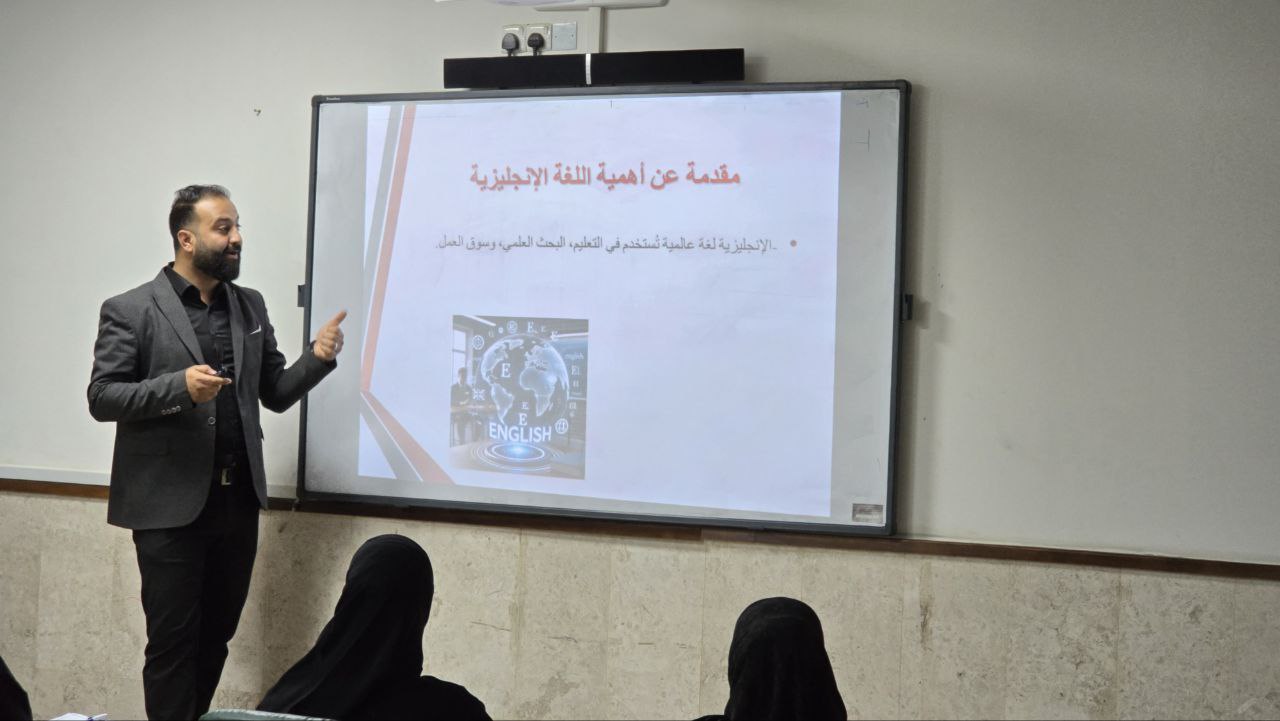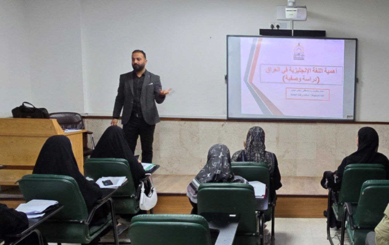 The College of Islamic Sciences held a scientific symposium titled "The Importance of the English Language in Iraq: A Descriptive Study," presented by Lecturer Mustafa Riyadh Al-Khafaji. The symposium explored the role of the English language in higher education, the job market, and international communication.