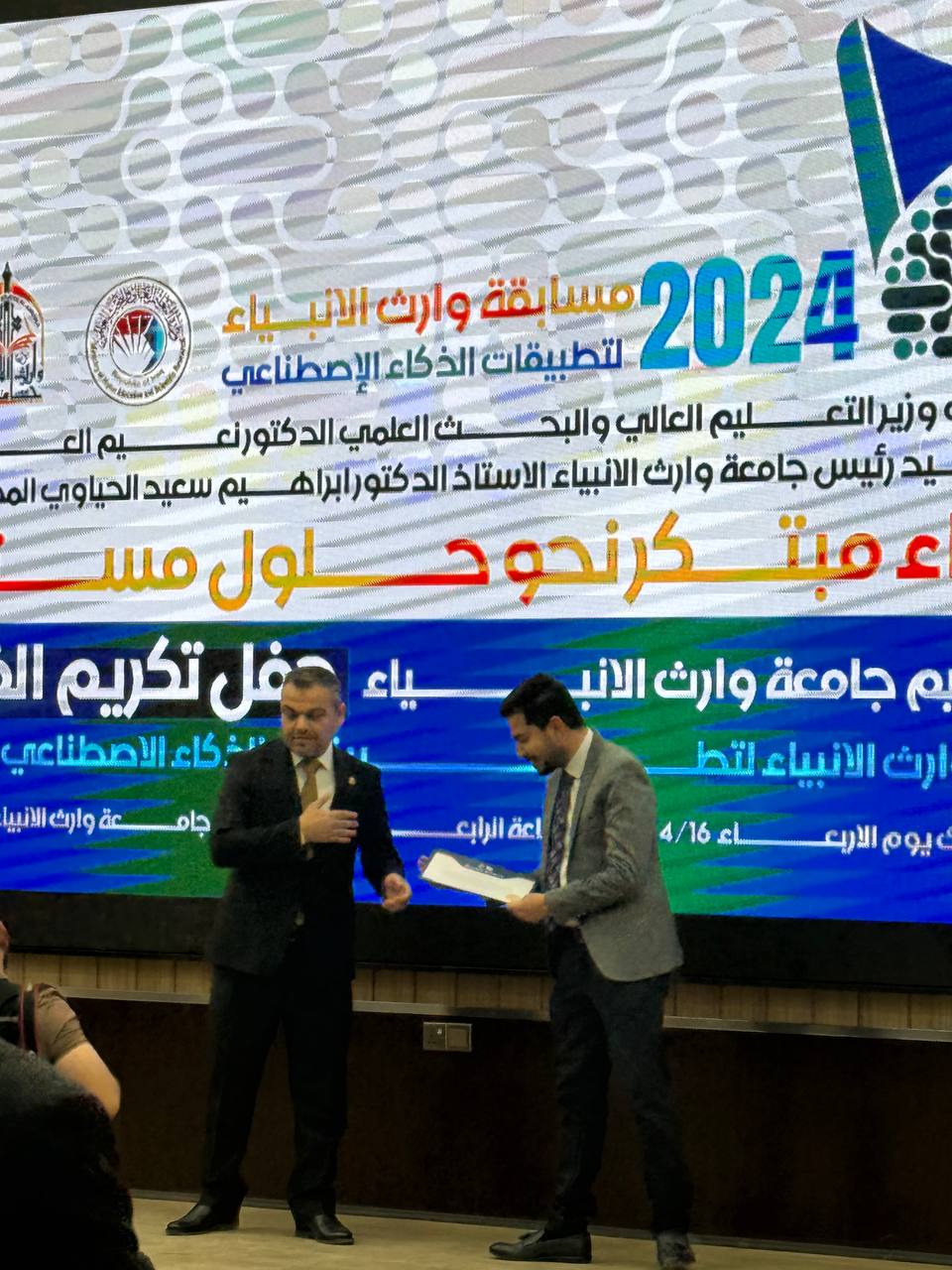 Dr. Ali Kareem, a faculty member at the College of Islamic Sciences, secured third place in the Artificial Intelligence Applications Competition organized by the University of Warith Al-Anbiyaa, which featured the participation of a distinguished group of researchers and programmers.