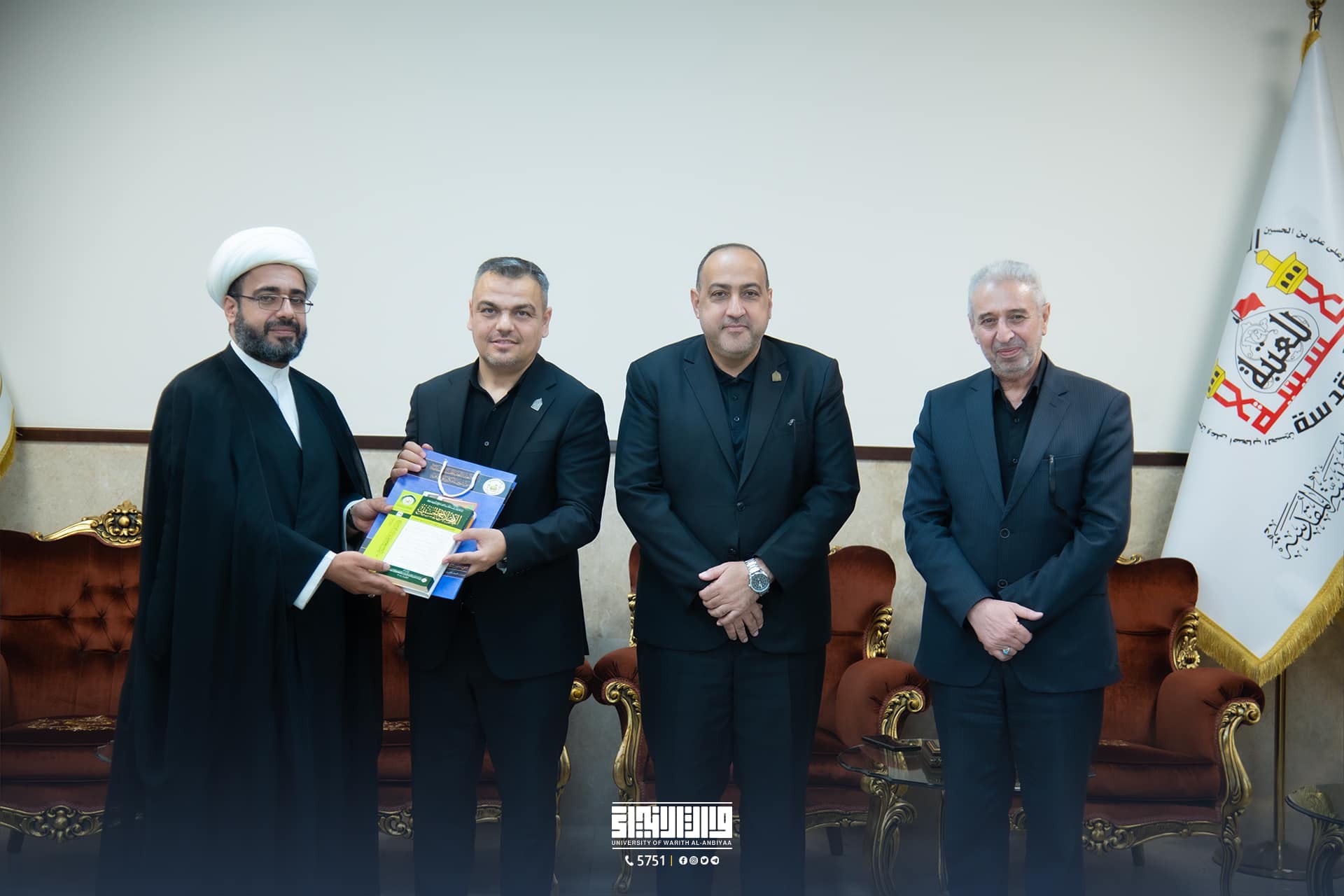 The President of Warith Al-Anbia University (peace be upon him), Professor Ibrahim Saeed Al-Hayawi, accompanied by Professor Dr. Waqid Al-Moussawi, Assistant President of the University for Scientific Affairs, and Assistant Professor Dr. Talal Faeq Al-Kamali, Dean of the College of Islamic Sciences, received a delegation from the Scientific Committee of Warith Al-Anbia Foundation for Specialized Studies in the Husseini Renaissance affiliated with the Holy Shrine of Imam Hussain.