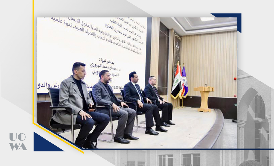 Warith Al-Anbiya University (peace be upon him), in cooperation with the High Commission for Human Rights - Karbala Office, organized a scientific symposium entitled "Intellectual Immunization against Terrorism and Violent Extremism", with the participation of the colleges of (Medicine and Law) at the university.The symposium was attended by Dr. Sabah Al-Jubouri, Majid Awda Al-Masoudi, and Nours Adnan, who presented scientific and analytical visions on the dangers of extremist thought, the importance of intellectual and legal awareness in limiting the spread of violent extremism, in addition to strategies for enhancing intellectual security in society.This symposium comes within a series of scientific events that the university is keen to organize, within the framework of its societal responsibility to spread awareness and combat extremism in all its forms.