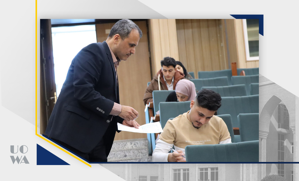 In the presence of the Dean of the College, Prof. Dr. Ali Abdul Saadoun, the Scientific Assistant, Assistant Professor Dr. Laith Al-Hussaini, and the Administrative Assistant, Lecturer Dr. Anwar Al-Dahan, the first stage exam for the subjects of Medical Terminology and Human Rights was conducted in eight classrooms, where the exams were conducted in an organized atmosphere according to the approved academic regulations and instructions. The Deanship of the College was keen to follow up on the progress of the exams in the field, and to ensure that the appropriate environment was provided for students to take their exams smoothly, while adhering to the organizational procedures that ensure transparency and justice. The importance of preparing the exam halls and providing the necessary supplies to ensure the comfort of students during the exam was also emphasized.