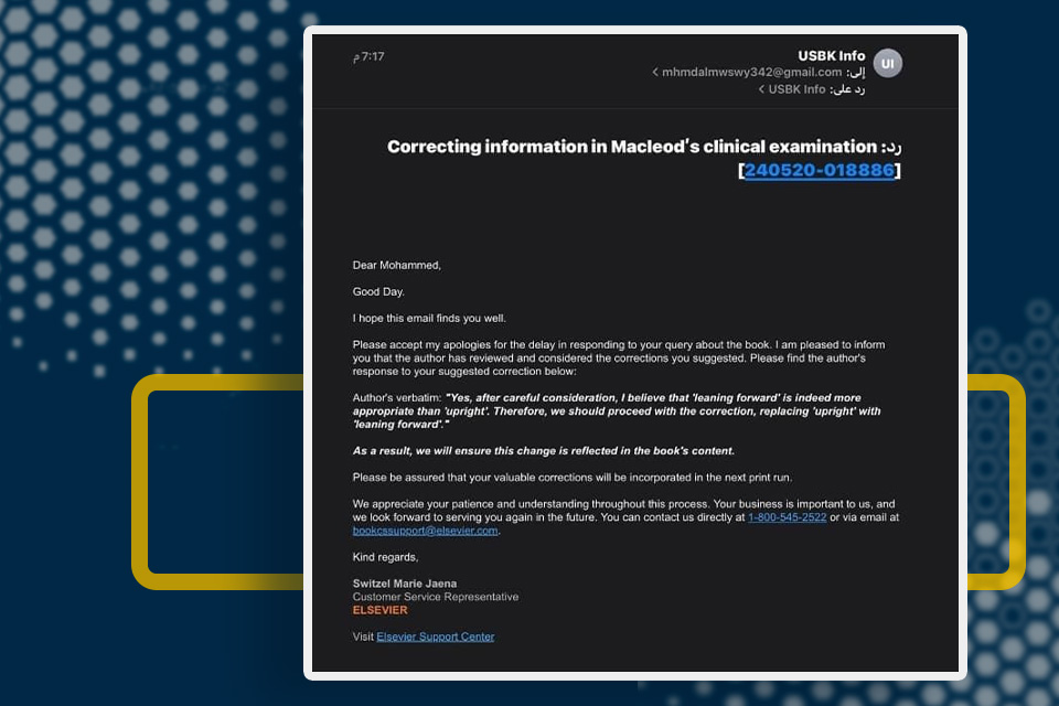 Student Muhammad Ali Kazem from the College of Medicine at the University of Warith Al-Anbiyaa (PBUH), fifth stage, made an astounding scientific correctness discovery when he found false information in the most recent fifteenth edition of the book "Macleod Clinical Examination."