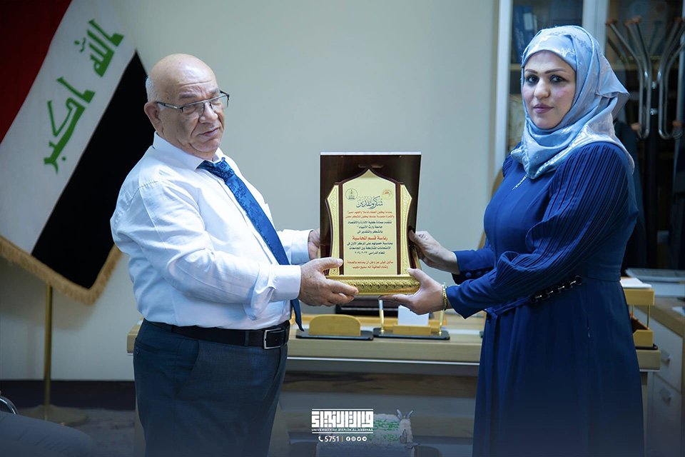 The head of the Accounting Department was honoured by Professor Dr. Awad Al-Khalidi, Dean of the College of Administration and Economics at the University of Warith Al-Anbiyaa (PBUH), on their achievement of taking first place in the joint exam held in the Holy City of Karbala among public and private universities.